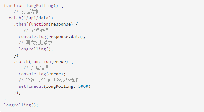 上述代码中,发起请求后如果服务器有数据可返回,就会调用 then 方法,处理数据并再次发起请求。如果请求发生错误,则调用 catch 方法,处理错误并延迟一段时间再次发起请求。