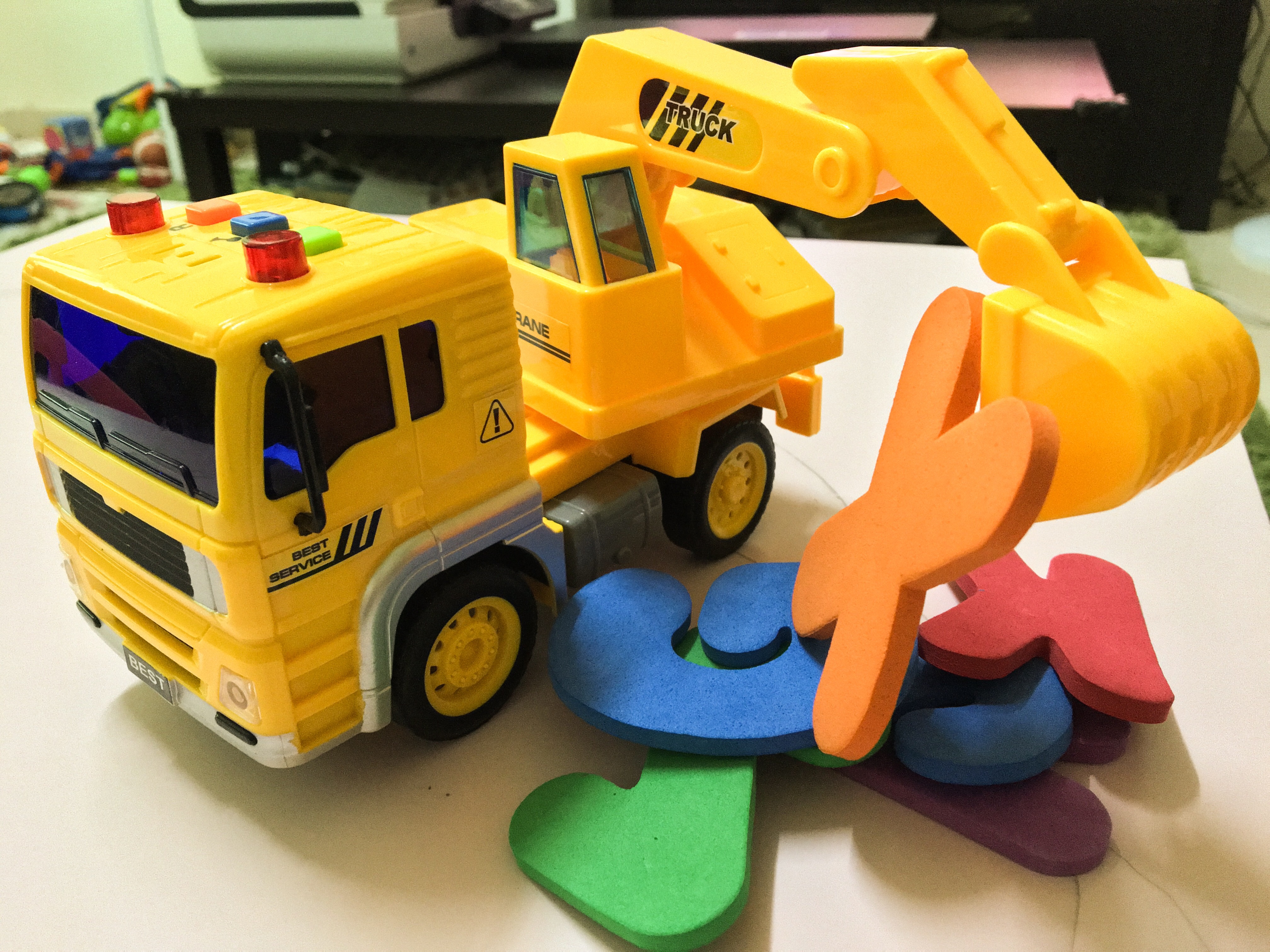 A construction vehicle that has a great big arm used for digging holes in the ground. It is sometimes called Excavator. Keep digging deep from left to right.My son is so excited everytime he sees a digger and so he picked this toy. Another one for him to scatter around the house. I know for sure all moms can relate to this!