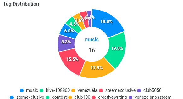 Saludos, amigos. La semana pasada la propuesta musical fue compartir canciones que nos llevarán en viaje a un lugar de la geografía del mundo. Algunos usuarios hicieron un viaje más emocional y temporal, y otros hicieron ambos, de manera que completamos una tarea muy completa e integral y lo más importante es que hayas disfrutado el proceso. Gracias @federicojavier ... A continuación algunas estadísticas cortesía de SteemStats de SteemHub sobre el desarrollo del concurso El análisis de este aspecto muestra un interés inicial generado por la convocatoria en sus primeros días, que experimenta luego un descenso paulatino en las participaciones hasta un par de días antes de la fecha de cierre. Los datos muestran la producción escrita en términos de la cantidad de palabras de las publicaciones, mostrando que en su totalidad cubren y superan con creces las expectativas. Mayoritariamente los participantes usan la etiqueta del club5050 y club100. El 37,5% de los participantes no se encuentra en el marco de los clubes. El análisis de los comentarios muestra un alto nivel de interacción entre los usuarios participantes, en correlación a las participaciones a lo largo del tiempo. Esta una gran fortaleza de esta comunidad, por lo cual los invitamos a continuar con esta excelente práctica. Esta semana experimentamos un récord en el número y en consecuencia promedio de comentarios por publicación. ✌🏻 La tabla muestra una grac actividad de interacción por parte de varios usuarios, donde destaca la usuaria @federicojavier. Ganadores Contamos con el apoyo de curadores que valoraron el contenido generado en este concurso por los usuarios. A ellos, gracias. Igualmente se pudo otorgar booming a varios participantes. Definimos los siguientes ganadores. Los premios ya fueron transferidos a sus monederos en forma de Steem y SP. Para mi acostumbrada despedida musical les dejo En mi viejo San Juan, muchas veces interpretada por los caballeros, esta vez en la femenina voz de Carmita Jiménez. Cc: @marcybetancourt @solperez @genomil @joslud @evagavilan