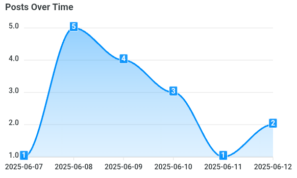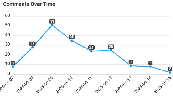 📅 Fecha 🔢 Cantidad 📊 % del total 📈 Tendencia 2025-06-07 8 4.2% 🔽 2025-06-08 28 14.7% 📈 2025-06-09 51 26.8% 📈 2025-06-10 35 18.4% 📉 2025-06-11 24 12.6% 📉 2025-06-12 25 13.2% 📈 2025-06-13 9 4.7% 📉 2025-06-14 8 4.2% 📉 2025-06-15 2 1.1% 📉 👥 Mejores comentaristas