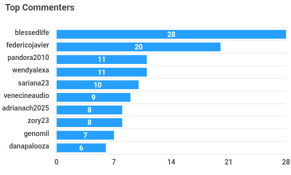 🏅 Lugar 👤 Autor 💬 Comentarios 📊 % del Total 🥇 Medalla 1 blessedlife (organizadora) 28 14.7% 🥇 2 federicojavier 20 10.5% 🥈 3 pandora2010 11 5.8% 🥉 4 wendyalexa 11 5.8% 🏅 5 sariana23 10 5.3% 🏅 6 venecineaudio 9 4.7% 🏅 7 adrianach2025 8 4.2% 🏅 8 zory23 8 4.2% 🏅 9 genomil 7 3.7% 🏅 10 danapalooza 6 3.2% 🏅