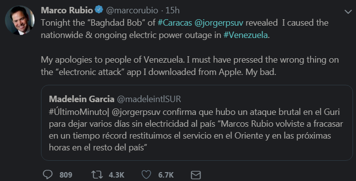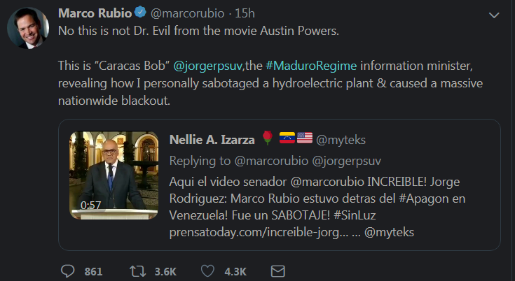 The news is roaring with this new blackout event in Venezuela and there is some finger pointing going around that might indicate that the US is behind this. Marco Rubio has made the joking statement that he must have pressed the wrong button on the 'electronic attack' app.