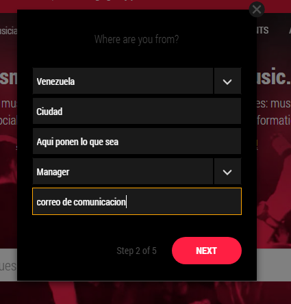 Pais, region, correo de organizacion tal cual como se lo estoy describiendo en la imagen en caso de haber seleccionado la opcion de profesional de la musica