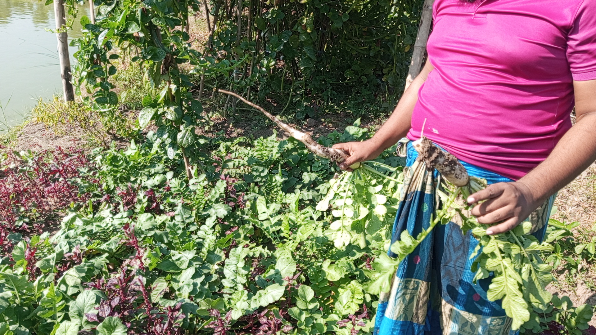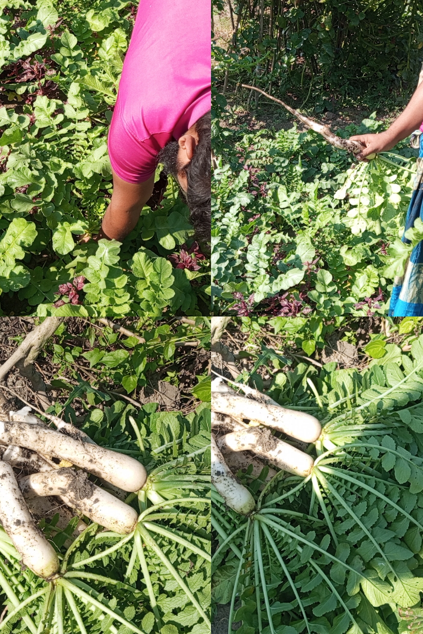 পুকুর পাড়ের সবজি চাষ করা একটি লাভজনক ফসল তবে আমাদের এদিকে বিভিন্ন অত্যাচারের কারণে সব পুকুর পাড়ে সব পুকুর আলাদা কিন্তু সবজি চাষ করতে পারেনা। এ মনে করুন আমার পুকুর পাড়ে চারিপাশ তারের জাল দিয়ে ঘিরতে খরচ হয়েছে দশ হাজার টাকা, সবাই তো এই ব্যয়বহুল খরচ বহন করতে পারে না। পাশাপাশি সাবমারসিবল পাম্প ফাইভ ব্যাটারি এই দিয়ে খরচ হয়েছে আট হাজার টাকার মত। এজন্য আমার সবজি চাষ করা বেশি সুবিধা হয়ে গেছে কিন্তু সবার পক্ষে এত খরচ যোগান দিতে না পারায় অনেকে চেষ্টা করে ব্যর্থ হয়ে যায়। এরপরেও রয়েছে অনেক অত্যাচারী মানুষের অত্যাচার বেড়া অতিক্রম করে এসে চুরি করে নিয়ে যায়। যাই হোক সে কথার দিকে না যাওয়াই উত্তম দুই বন্ধু মিলে দেখার মত মুলাগুলো তোলার চেষ্টা করলাম। পাশাপাশি আরো অন্যান্য শাকসবজি উত্তোলন করলাম।
