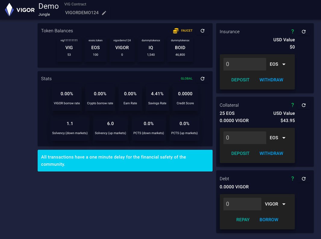 To interact with the contract through the demo interface go to: https://app.vigor.ai/