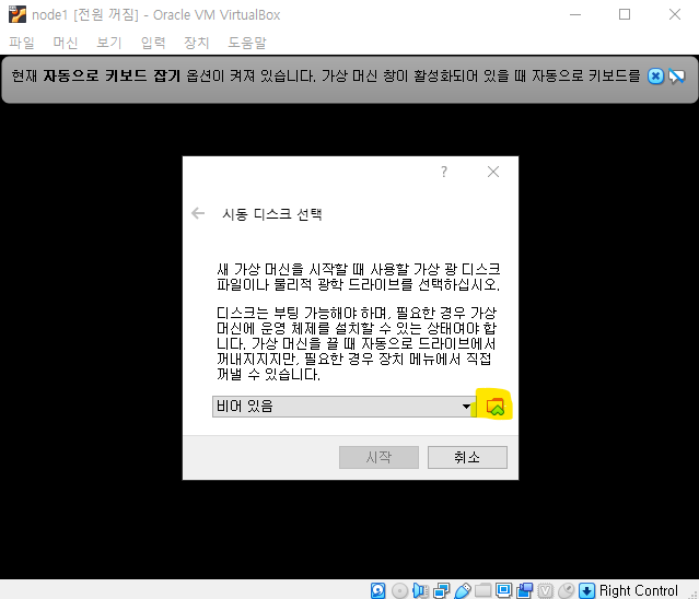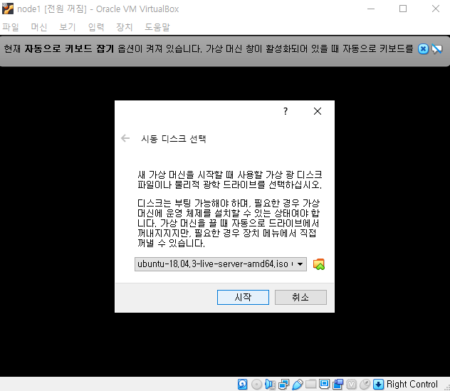 - 사용 디스크 선택 (미리 준비해둔 ubuntu 이미지 선택 후 "시작" 버튼 클릭)