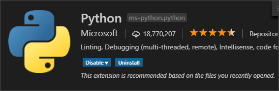 그리고 설치가 완료되면 익스텐션을 설치해주어야 하는데 Python을 검색하면 맨 윗쪽에 뜨는 다운로드수가