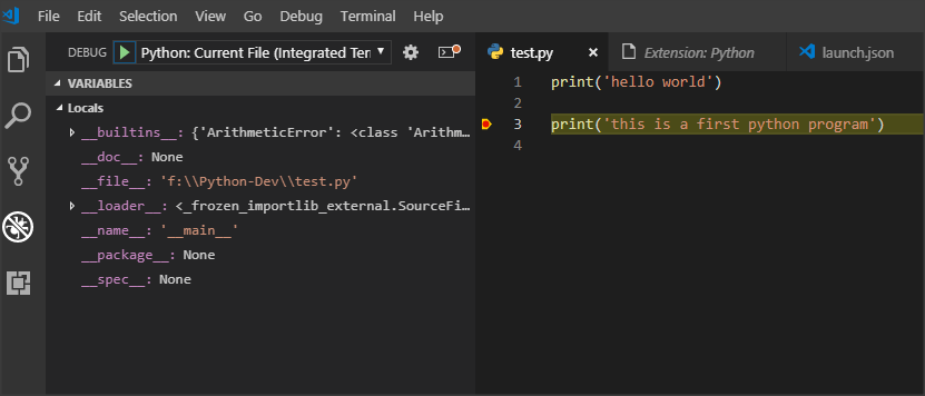 그후 test.py파일을 다시 열어 원하는 라인에 맨앞쪽을 클릭하여 Breakpoint를 걸어주고 왼쪽 윗쪽에 있는 Debug 글짜옆에 있는 실행버튼(Play버튼모양)을 클릭하면 Breakpoint 가 잘 걸리는 것을 볼수 있습니다.