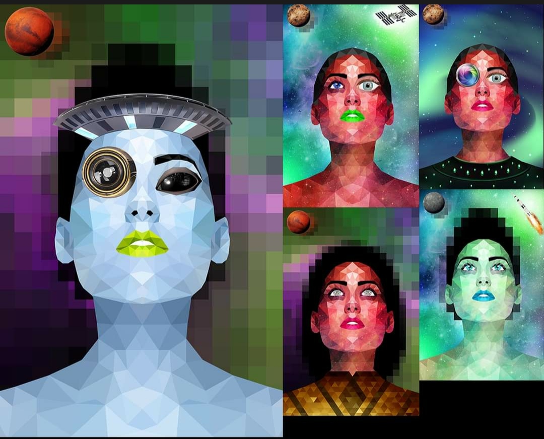 The collection of HomoSpaciens is a type of Digital Art, also known as NFT. We used geometrical shapes for the outline design of the art's face and body, and then we created the rest by combining various features selected randomly using software meant for the creation of NFT.