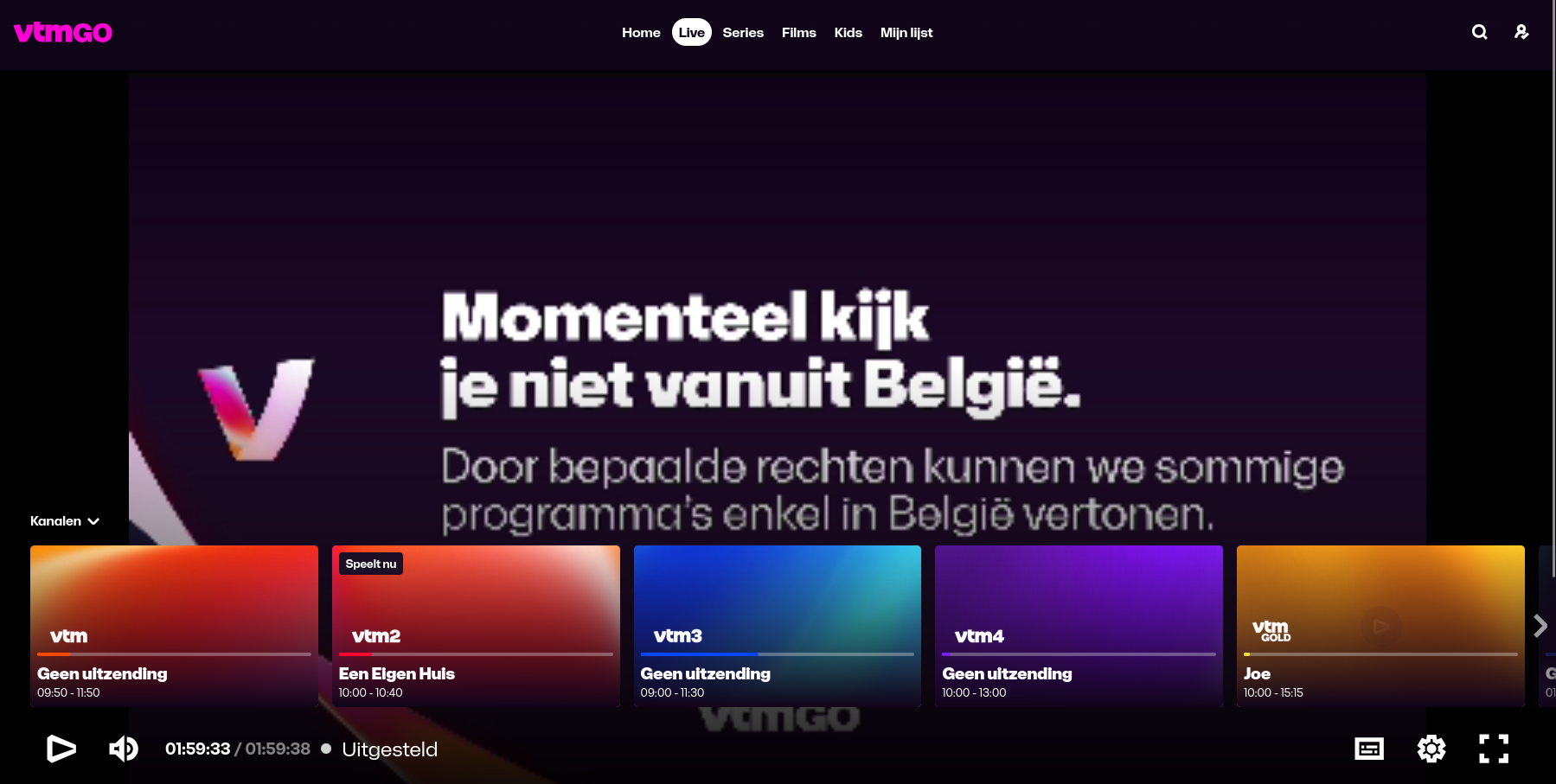 Wanneer je vanuit Nederland (of ergens anders buiten België) probeert te kijken, krijg je vaak een melding zoals op de afbeelding: “Momenteel kijk je niet vanuit België.” En klaar is het feest.