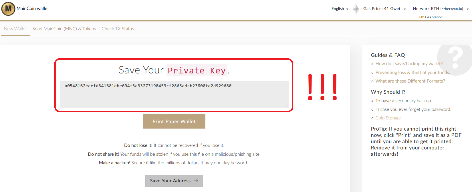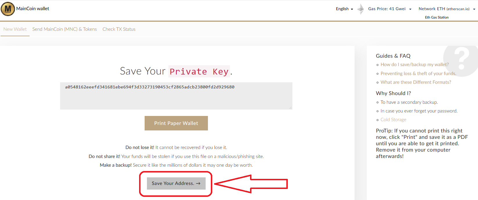 Wenn die „Paper Wallet“ ausgedruckt bzw. an einem sicheren Ort abgespeichert wurden. Kann man das Erstellen der Wallet, mit Bestätigung der Schaltfläche „Save Your Address“ abschließen.