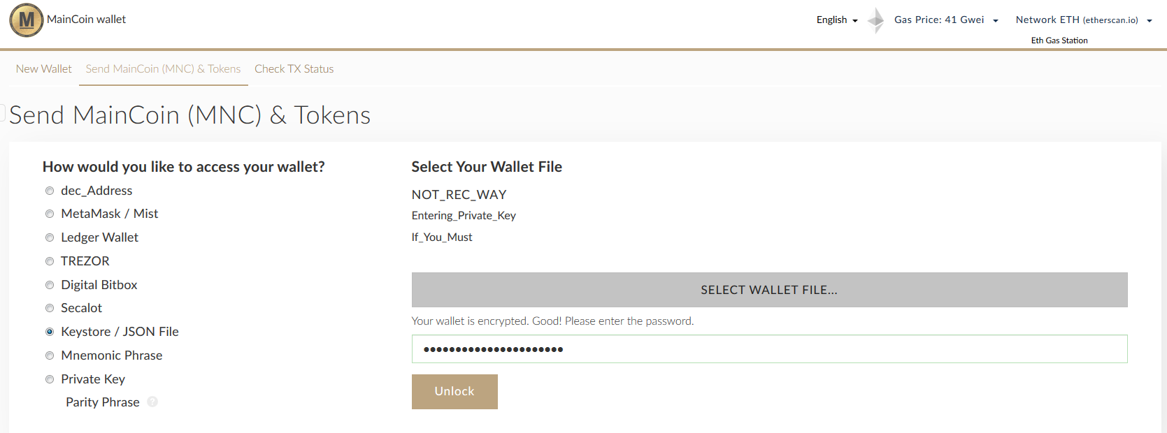 Nach Eingabe des Passwortes, kann man sich durch Bestätigung der Schaltfläche „Unlock“ in die Wallet einloggen. Nun erscheint der Desktop der Wallet, wo man Maincoin (MNC) Token versenden kann.