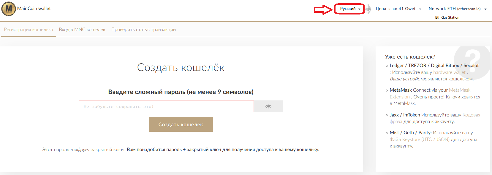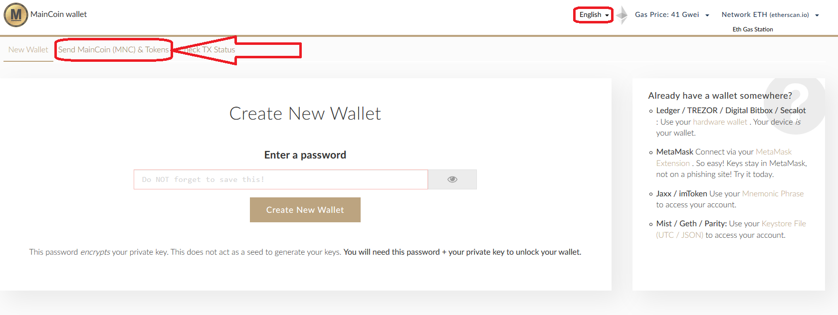 Nachdem man mit Eingabe der URL https://wallet.maincoin.money die Wallet startet, sollte die Sprache auf Englisch eingestellt sein.