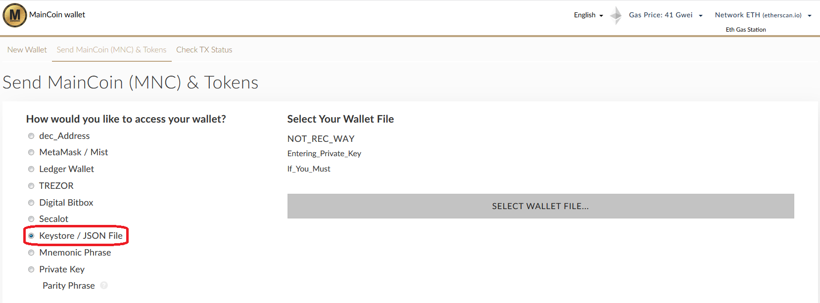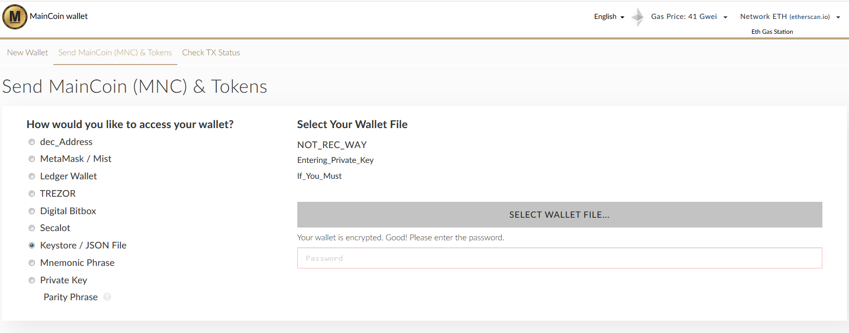 Die beste und sicherste Option sich in die Wallet einzuloggen, ist das bei der Erstellung gespeicherte „Keystore File“ und das vergebene Passwort.
