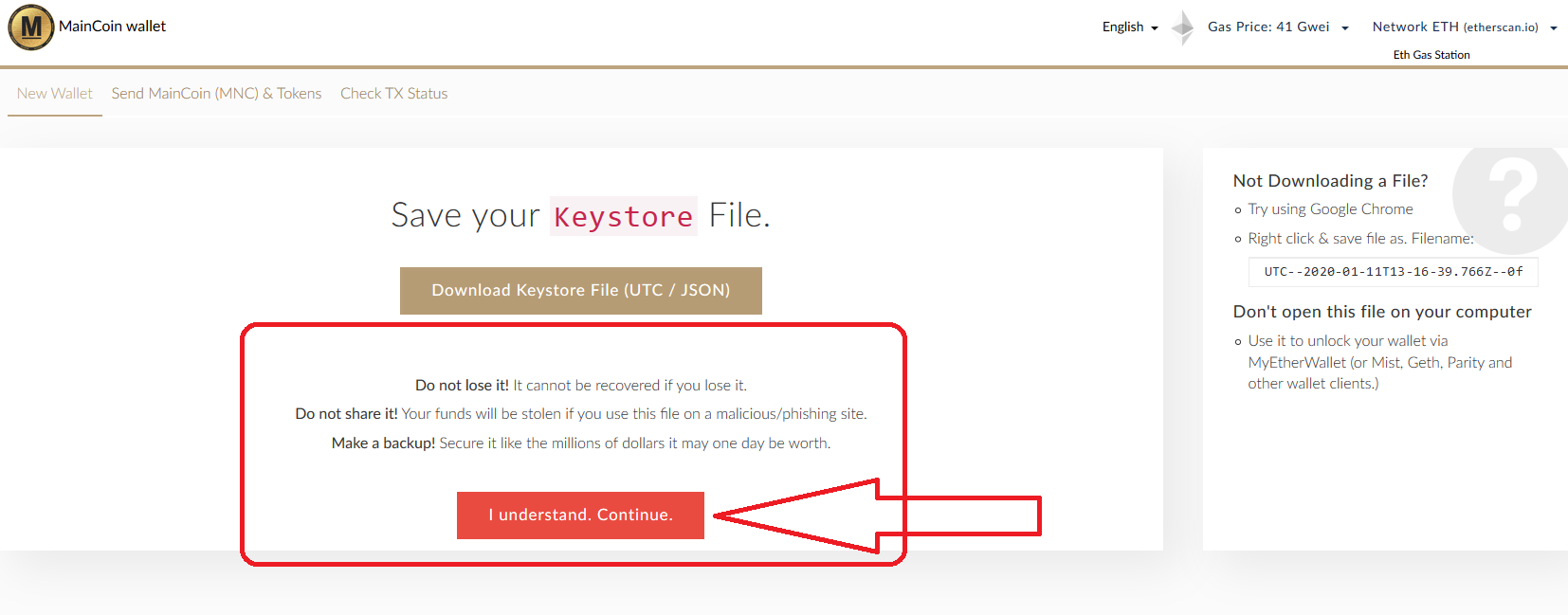 Wenn man das „Keystore File“ an einem sicheren Ort abgespeichert hat, kann man den Sicherheitshinweis bestätigen.