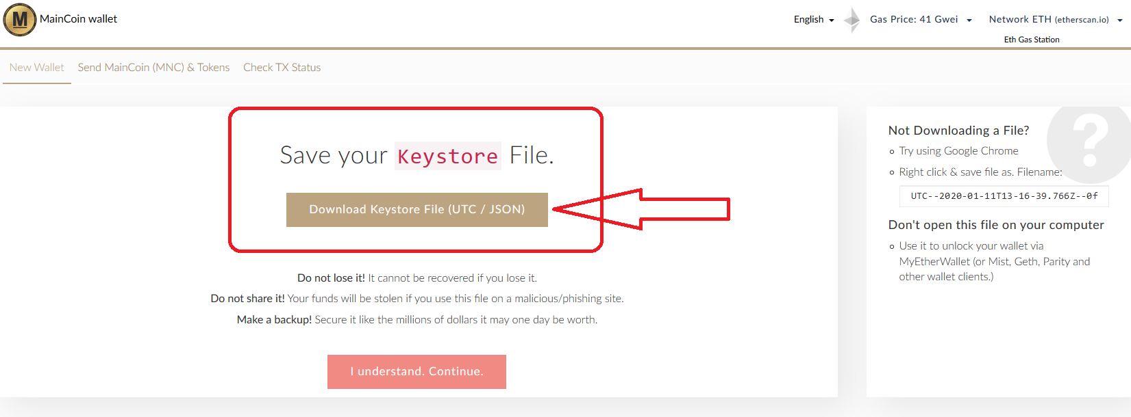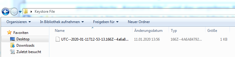 Als nächstes sollte das „Keystore File (UTC/JSON)“ an einem sicheren Ort gespeichert werden. Denn dieses File benötigt man später, um sich zusammen mit dem zuvor vergebenen Passwortes in die Wallet einzuloggen.
