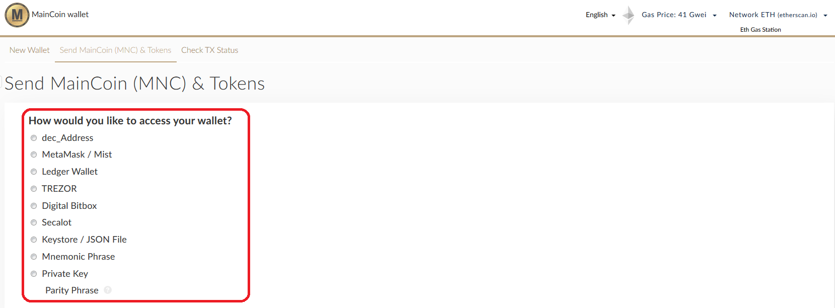 Mit dem Klick auf den Reiter „Send MainCoin (MNC) & Tokens“ gelangt man auf den Login Bildschirm.