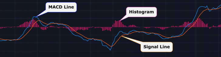 There are three main components to the MACD indicator: the MACD line (blue oscillator), the signal line (orange oscillator) and the histogram.