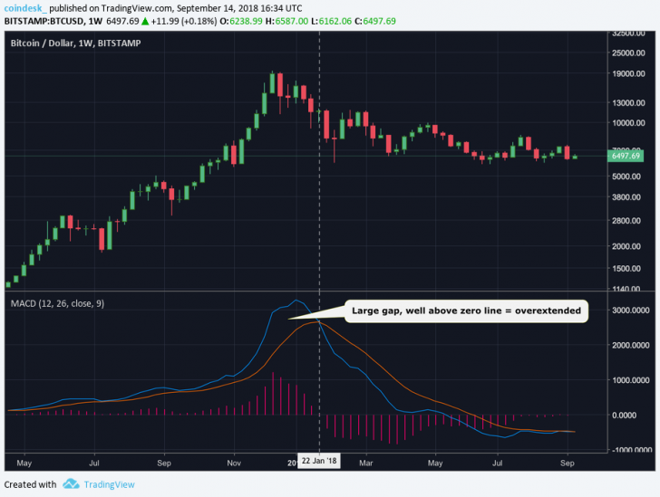 As can be seen, the MACD line began to stray noticeably far away from the signal line in December of 2017. Also at this time, both the MACD and Signal were well above the zero line.