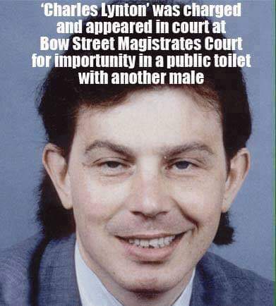 ” He was charged and appeared in court at Bow Street magistrates court for importunity in a public toilet with another male. He tried to get sexual favour from the other man, little did he know that the toilet was being watched by police. Blair was fined £500, and walked away with nobody knowing who he really was as he used his middle names to cover who he was. Charles Lynton is the name used, and his friends in court got him off with a fine