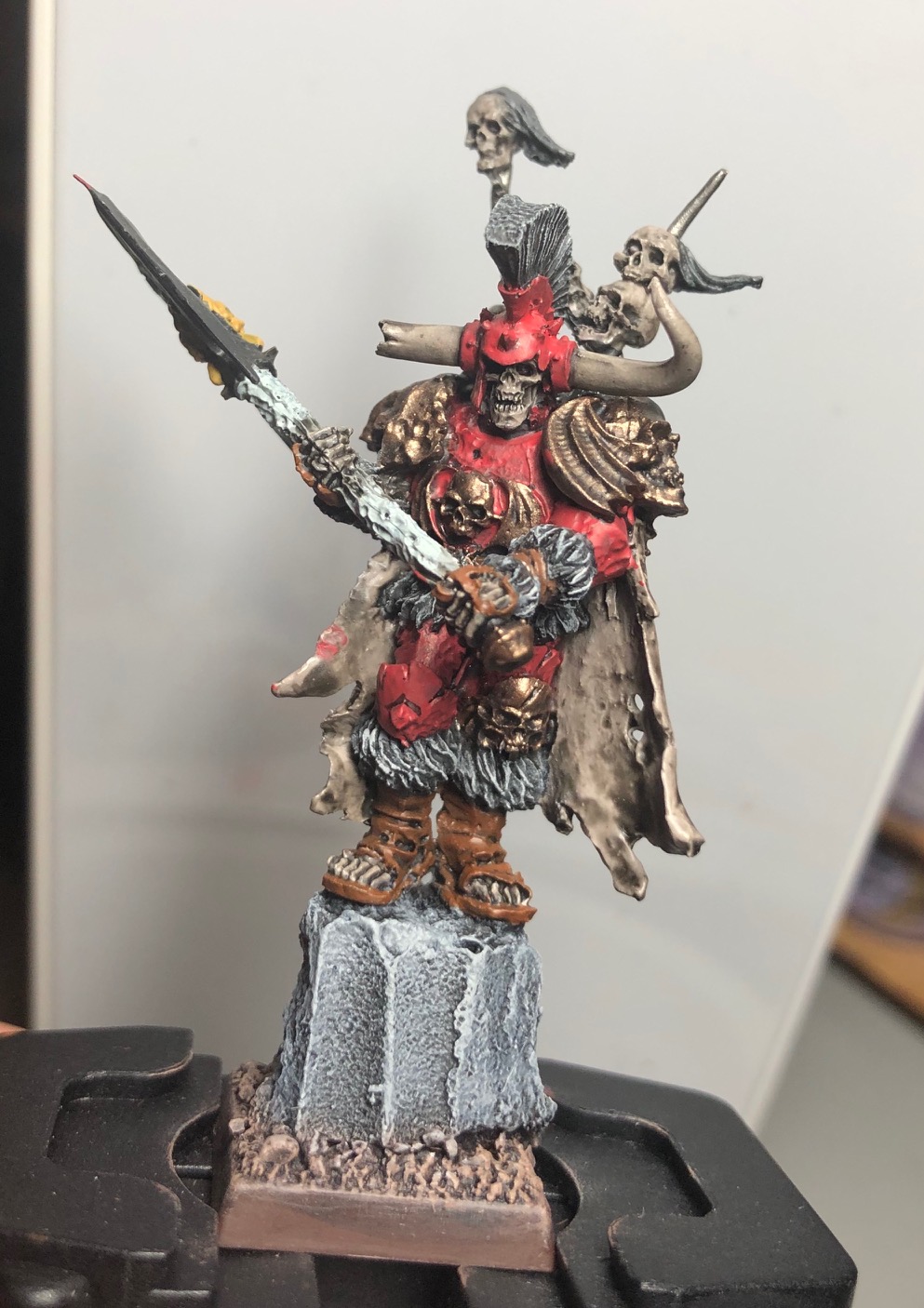 I recently painted up the most recent version of Krell. He was once a ruler of a barbarian tribe before he became a Chaos Champion after being corrupted by the Chaos God Khorne. He then went on to cause massive amounts of destruction with his army across the world until he was eventually killed by the Darwi hero, Grimbul Ironhelm. Nearly 1500 years later he was resurrected by Nagash to fight in his undead armies. Krell still retains some of his powers from Chaos which make him an exceptional undead fighter and his armour is practically impenetrable.