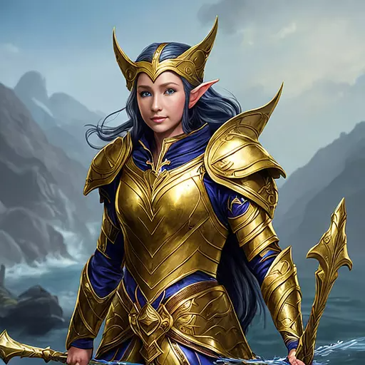 CLOTHING: Thalindra wears golden armor with blue fabric accents that ripple around her like ocean waves. The armor is light and graceful, adorned with intricate details that make it unique. Thalindra wields two semi-golden elven swords with transparent blades, reminiscent of water, shaped from the depths of the ocean.