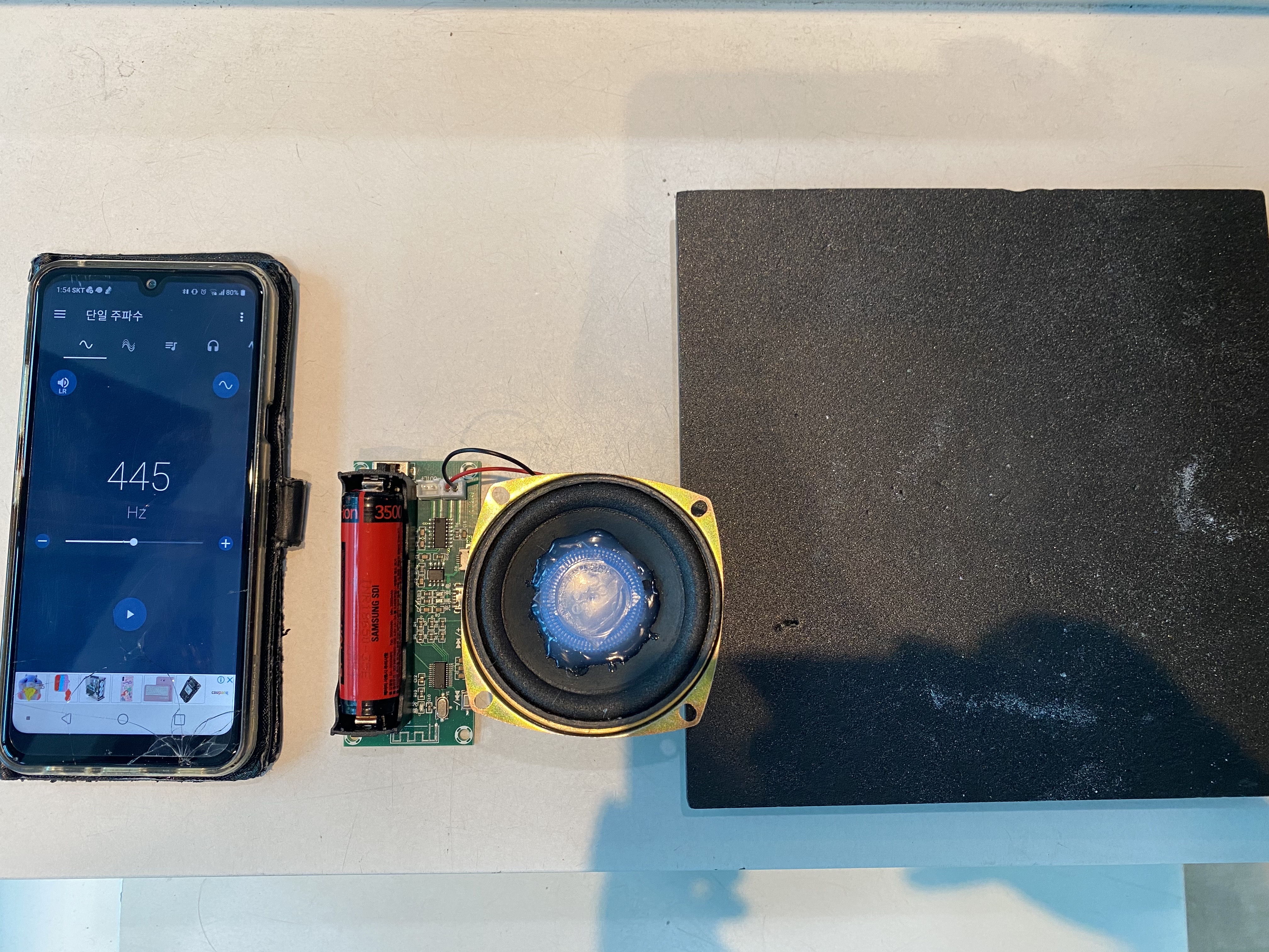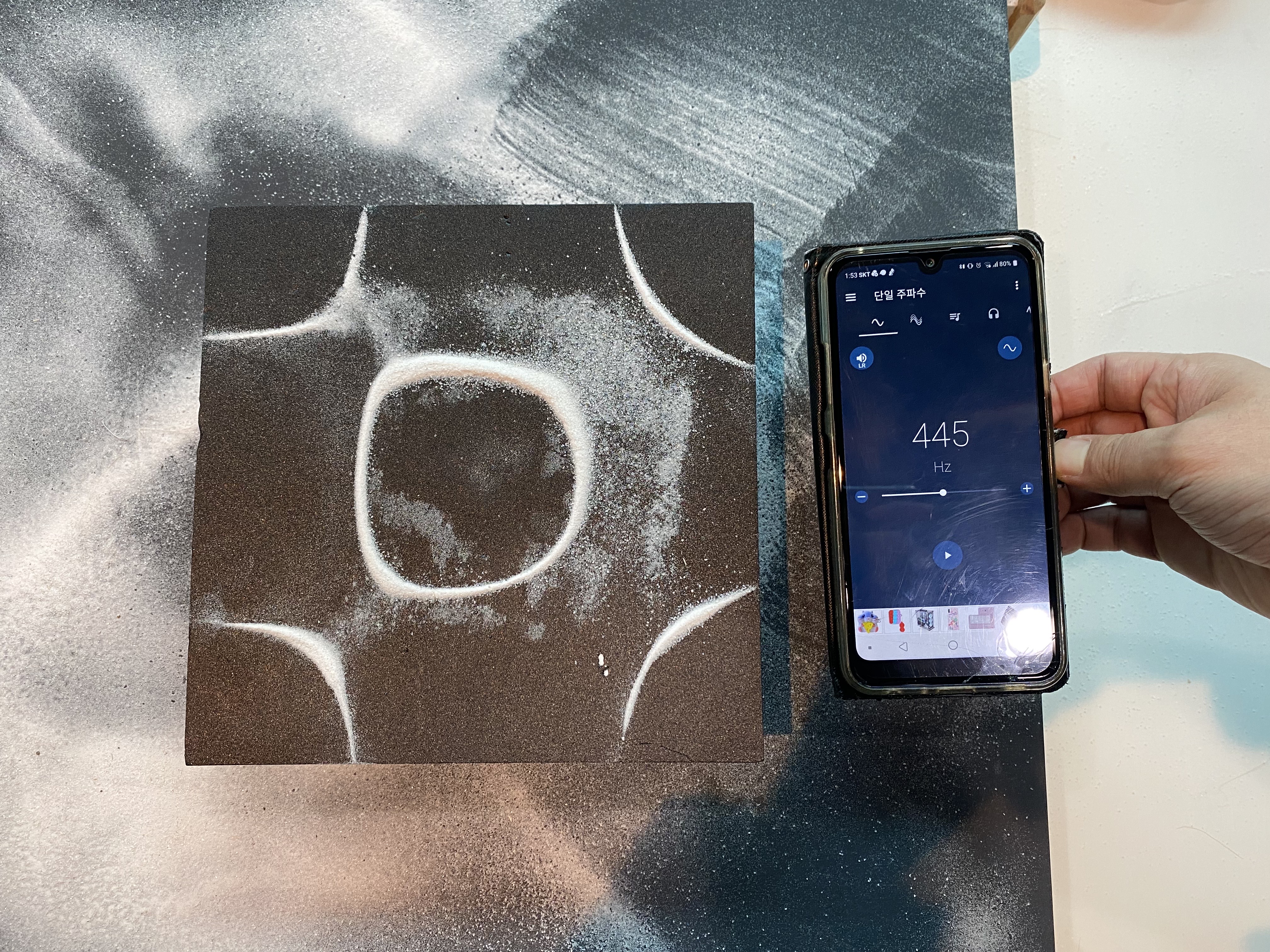 앰프와 병뚜껑, 사각형 우드락을 글루건으로 연결시킨 후, 스마트폰을 블루투스 스피커 앰프에 연결시킵니다. 사각형 우드락에 약간의 모래를 뿌린 후 주파수 발생기를 실행시키면 소리의 파동에 의해서 진동이 생기며 이에따라 모래가 움직이며 특정 주파수에서 일정한 모양을 띠게 됩니다. 이를 클라드니 도형이라고 합니다.