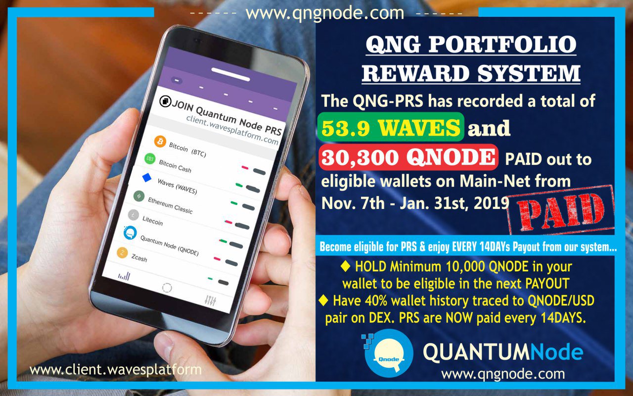 The QNG has recorded a total PRS payout of 53.9WAVES & 30,300QNODES in Just 3 months to Portfolio eligible wallets.