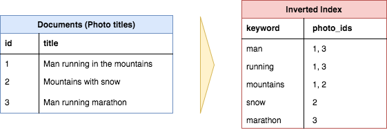 Example showing how three document titles are converted into an inverted index to facilitate fast lookup from a specific keyword to the documents with that keyword in the title. Note, common words such as “in”, “the”, “with”, etc. (called stop words), are typically not included in an inverted index.