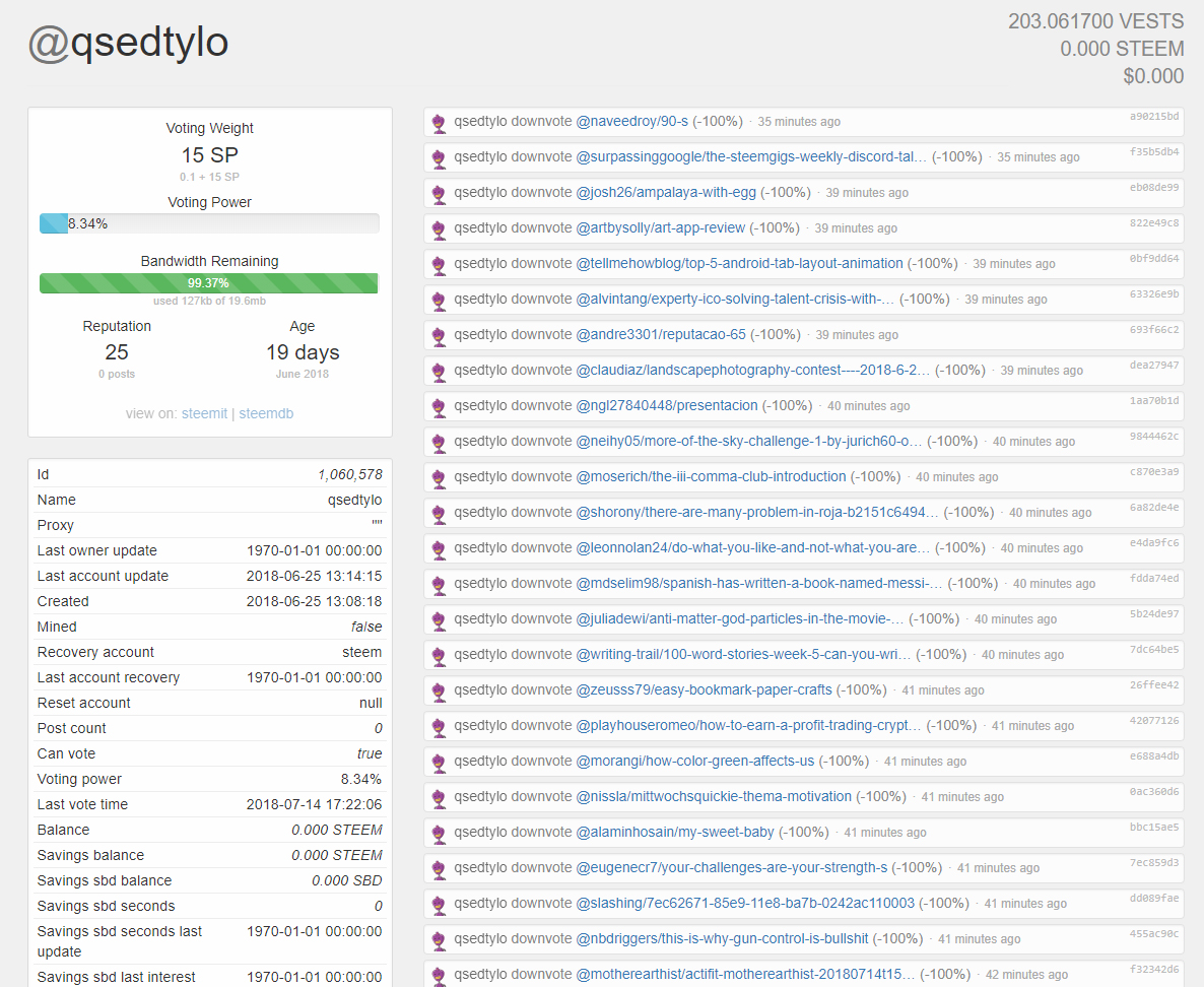 @qsedtylo downvoted this post. It is an account that only downvotes other accounts. I've left a comment to @quarantine's post: https://steemit.com/downvote/@quarantine/down-votes-accounts-use-for-harrassment