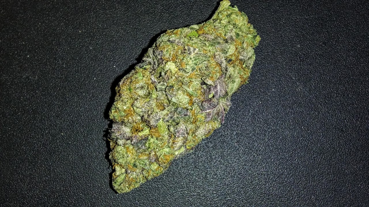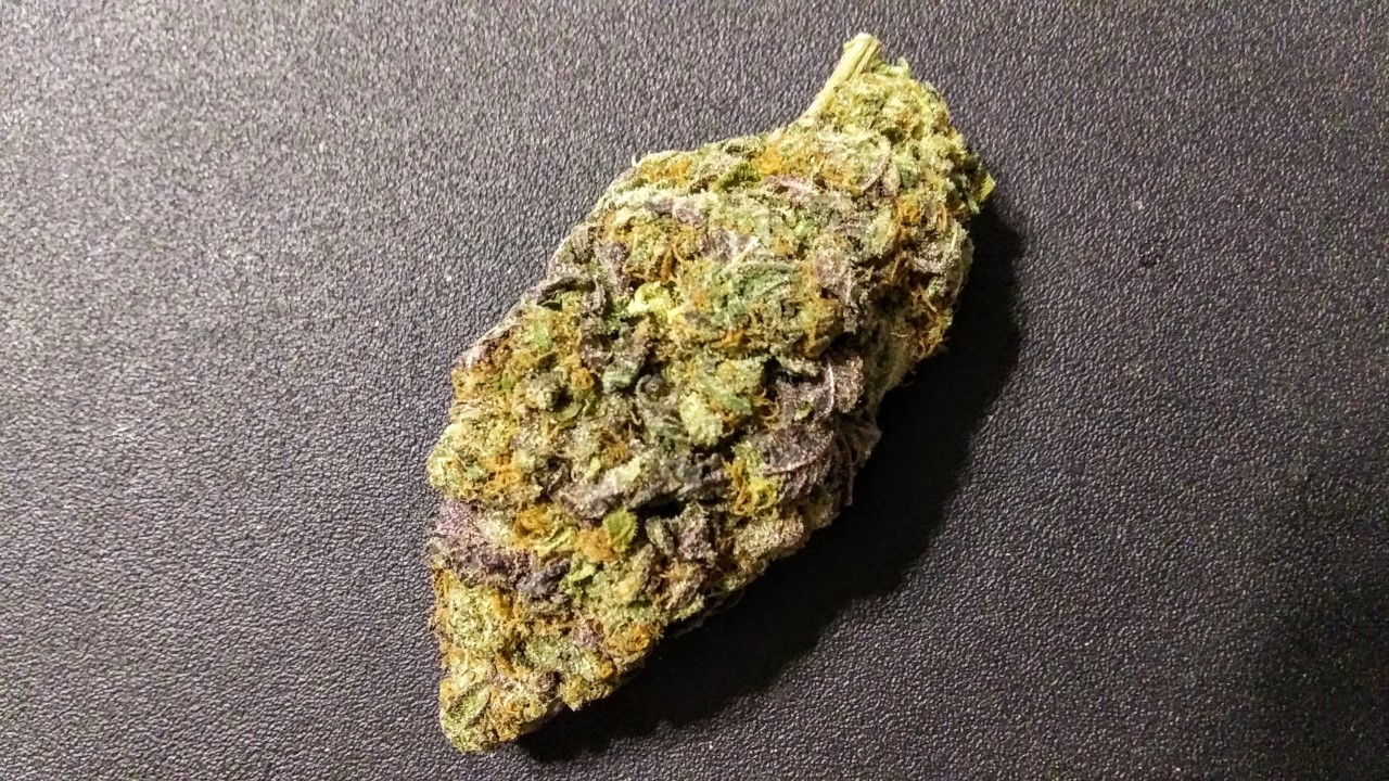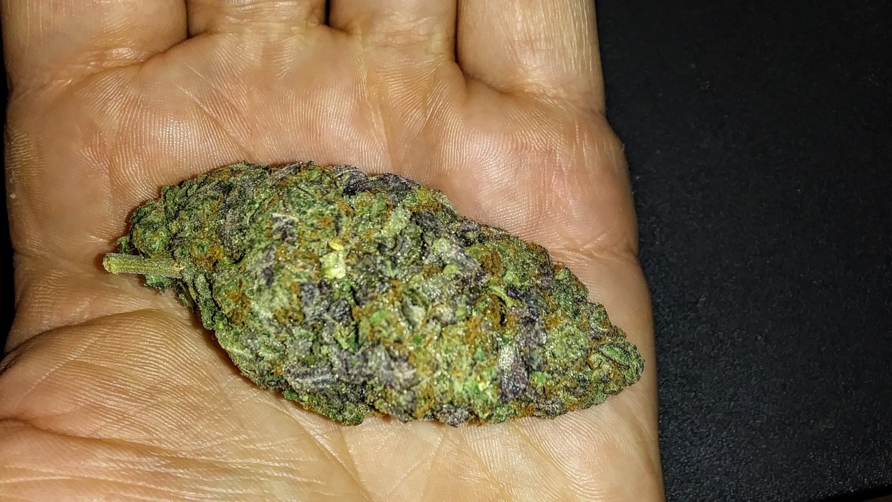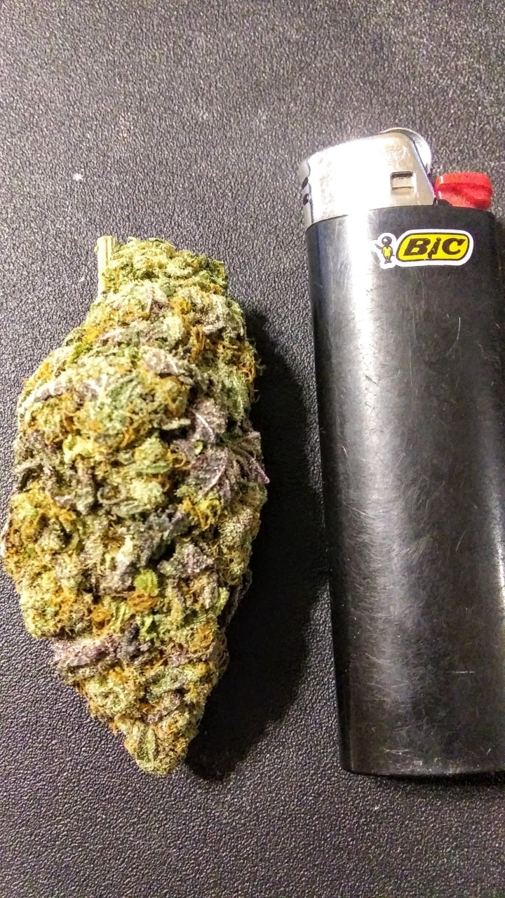 Weighing in at 4.5 grams this thing is HUGE!!! It is almost as big as the lighter. Look at all the purple and orange hairs in this thing. I've never seen this much purple in a nug before. It's like a mini Christmas tree with all these colors HA HA. The shiny crystals can be the Christmas lights.
