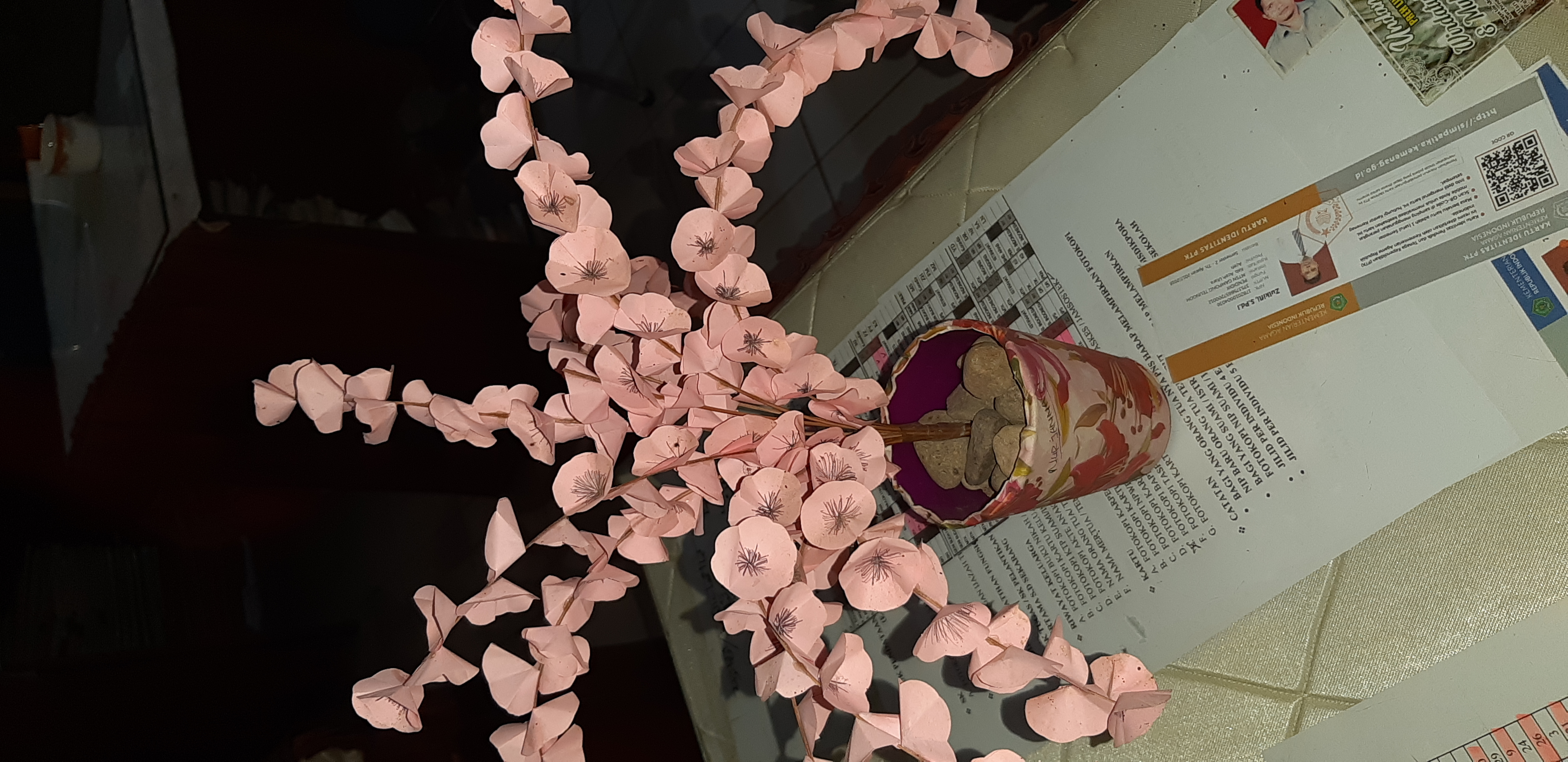 Bunga sakura dari kertas ini di buat oleh teman saya yang bahannya diambil dari kertas kertas yang sudah di pakai atau dengan kata lain kertas bekas.