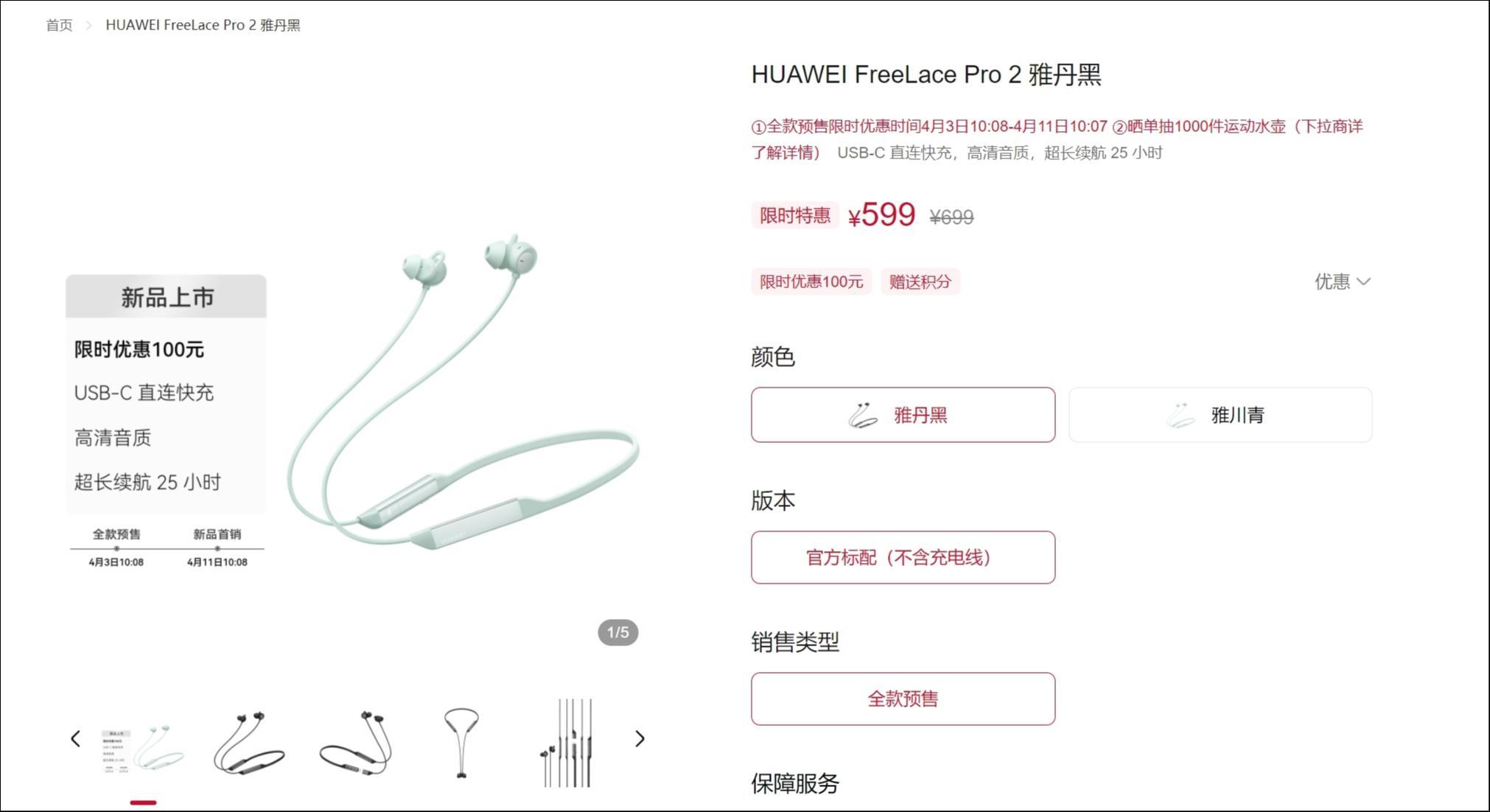 但是钛媒体App也注意到,早在4月3日,华为就已经在官方商城突然上架了一款音频产品:HUAWEI FreeLace Pro 2。如果按照产品发布时间排序,那么排在最前面介绍的应该是华为的音频产品线而非智能穿戴,因此对于数码博主提出的发布形式以及发布内容的排序目前仍然存疑。