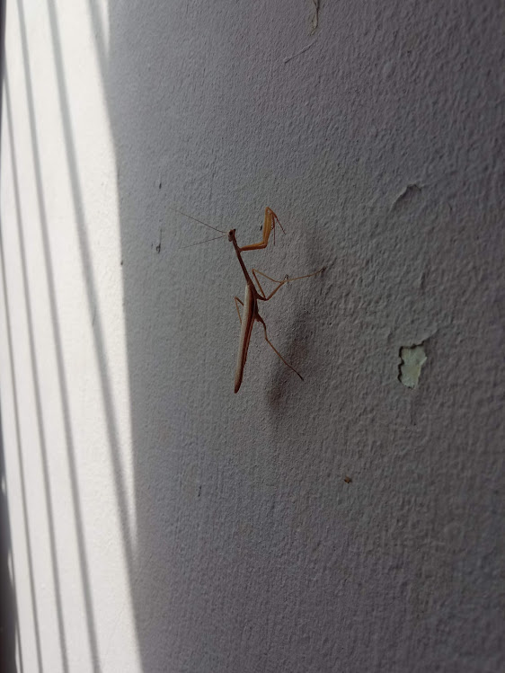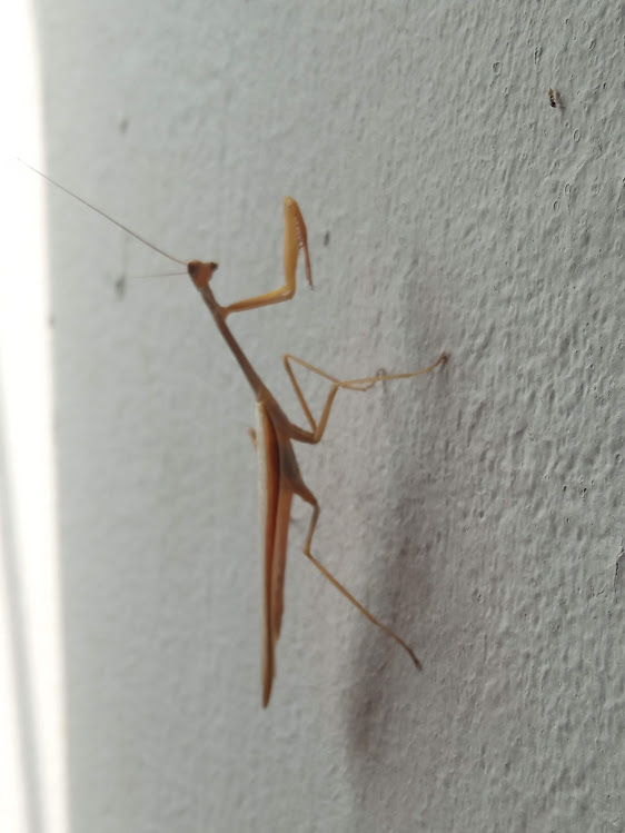 I used to get visits from mantises but for about a month I haven't seen one near my house. Today it was a surprise to find this mantis on the wall while I was knocking on the door.