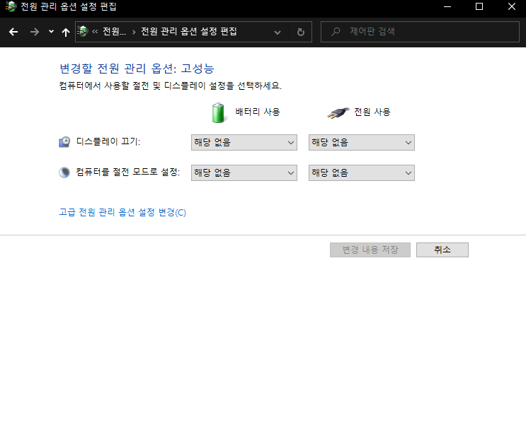 #####전원 관리 옵션 설정 편집 ( 고성능 -> 설정 변경)