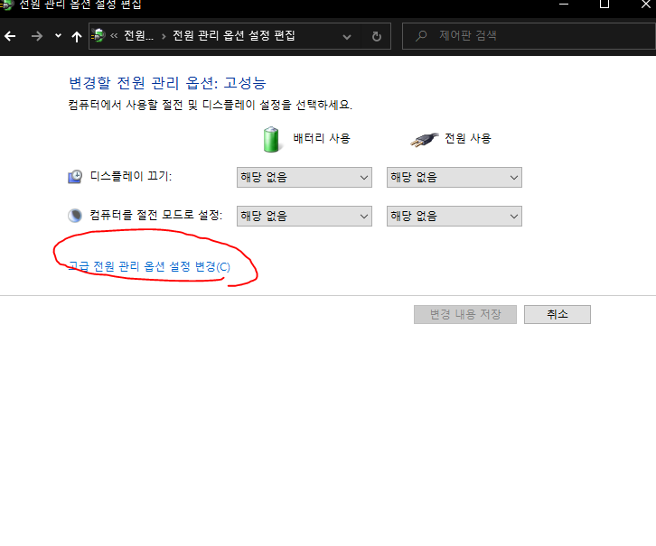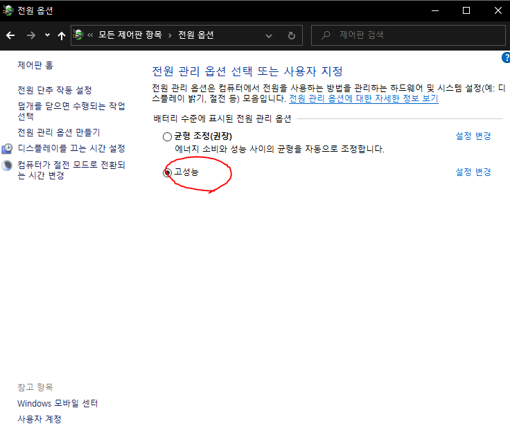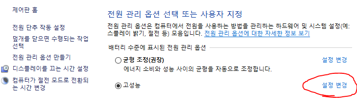 다음은 고성능 오른쪽에 보이는 설정 변경을 들어가주세요.
