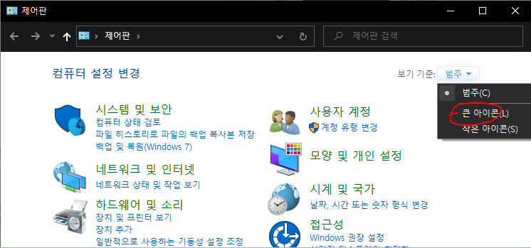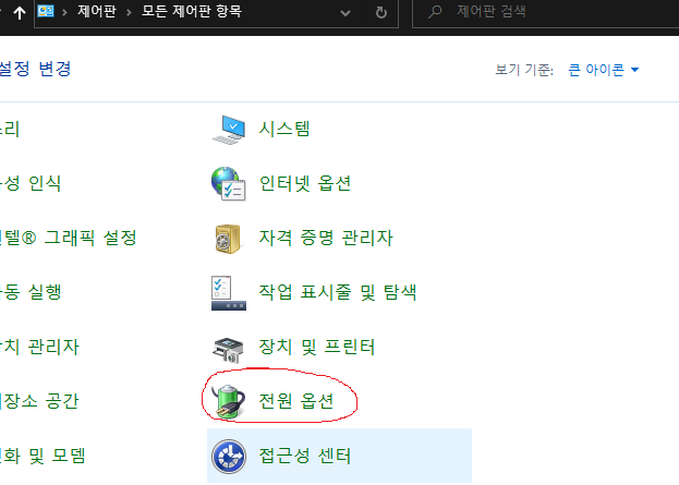 제어판 -> 범주를 큰 아이콘으로 변경 -> 전원옵션 -> 전원 옵션에서 고성능