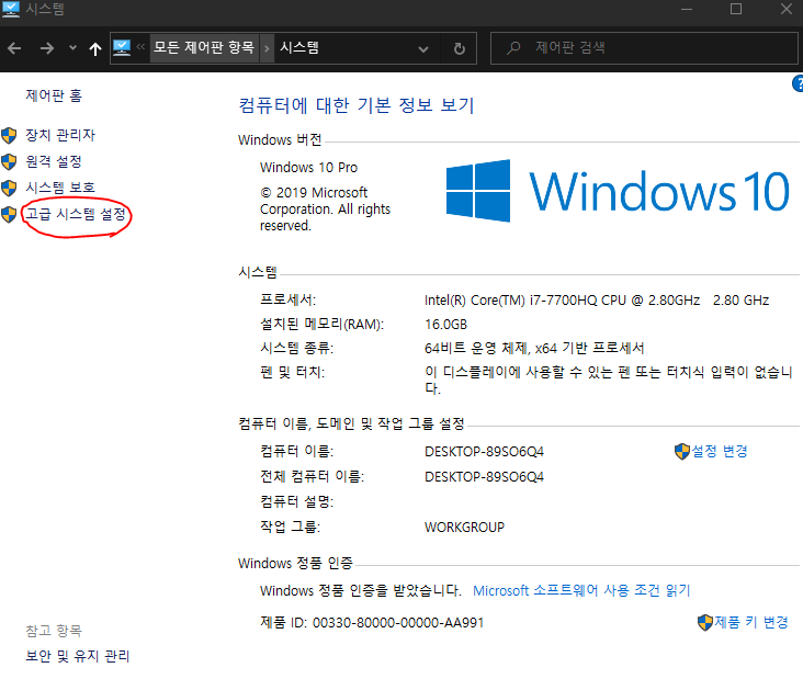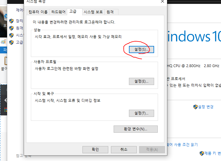 내 컴퓨터(내 pc) 우클릭 => 속성 => 고급 시스템 설정 => 설정