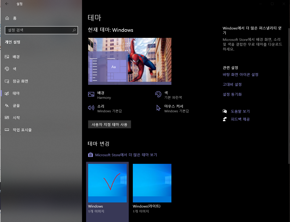 저 '테마'로 들어가셔서 체크 누르시면 기본 바탕화면이 되는데요 이게 제일 빠릅니다. 화려한 것을 쓰면 이쁘긴 하지만 바탕화면 로딩하는데 좀 더 걸릴 수 있어요.
