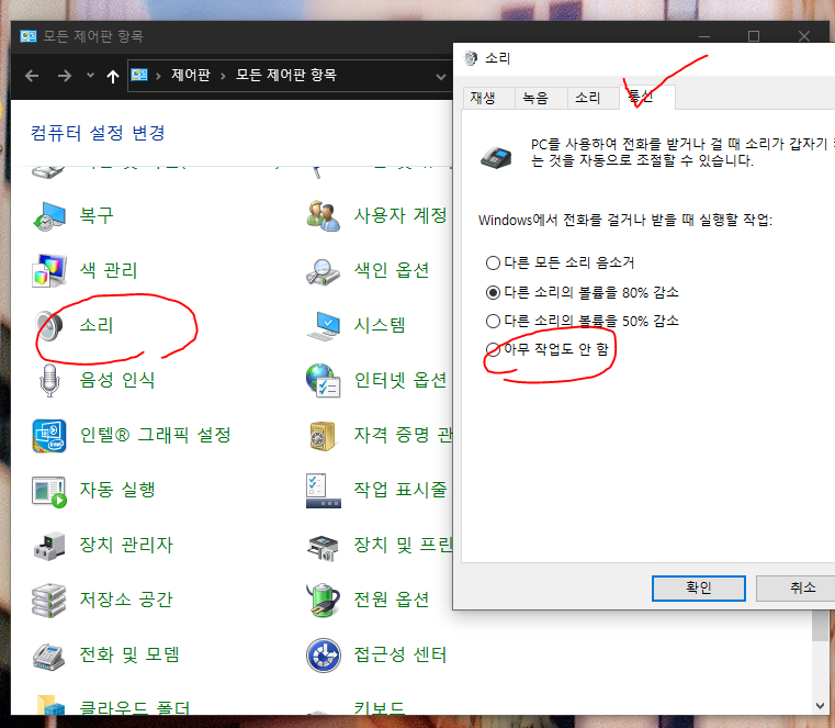 #####제어판 =>소리 => 통신 => 아무 작업도 안함 클릭 =>적용