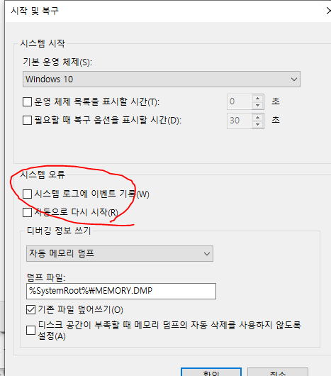 시스템 로그에 이벤트 기록, 자동으로 다시 시작도 해제해 주세요. => 확인