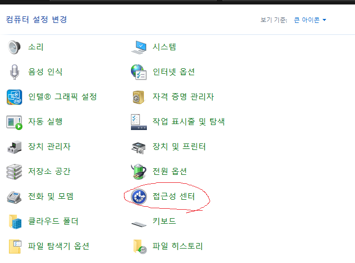 제어판 =>접근성 센터에 들어갑니다. (소리주의)