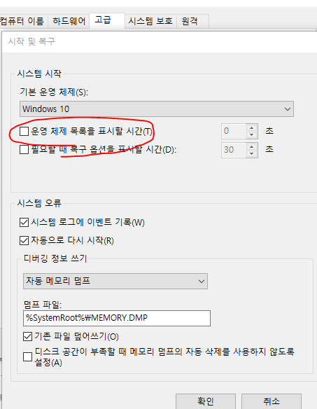 운영체제 목록을 표시할 시간의 체크를 해제해주세요.