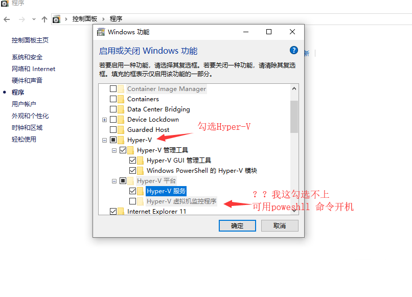 PS:无法开启Hyper-v 全部功能的时候可以通过“powershell管理员” 来开启