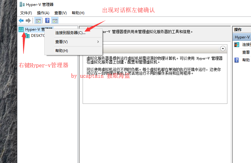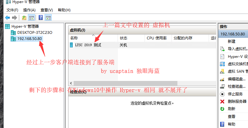 可以看到经过以上步骤,客户端Hyper-v 连接到服务端 之后读取了上一篇文中设置的服务器和服务器中的虚拟机。 具体操作就不展开了因为和本地操作win10虚拟机相同。