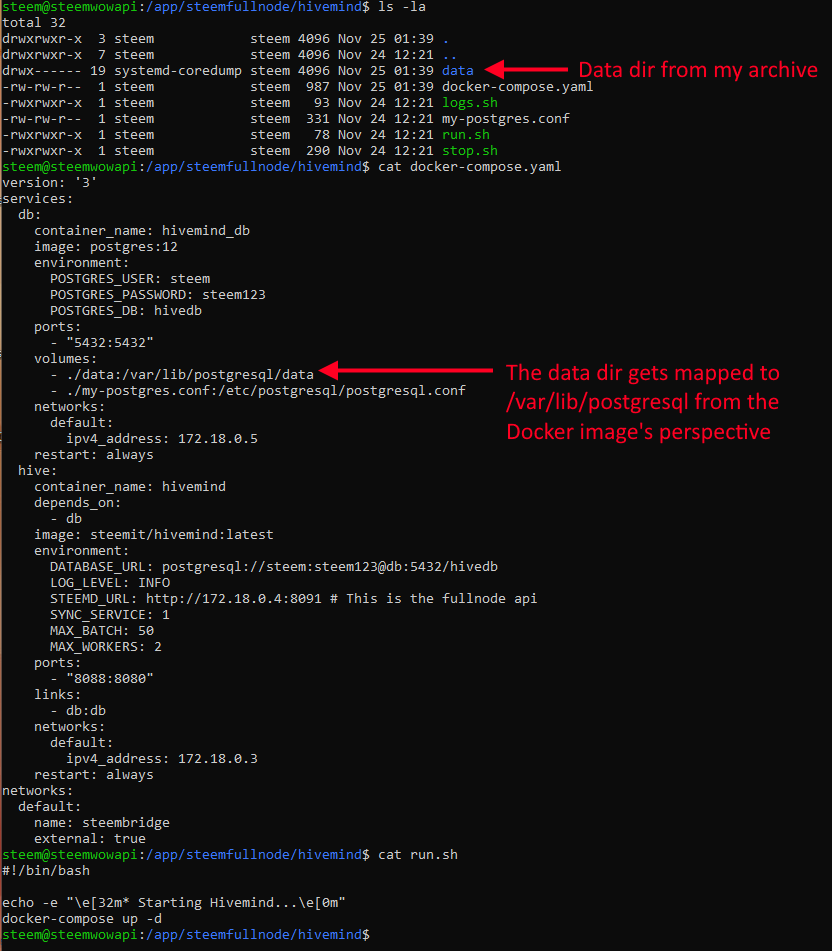 They'll unpack to a directory named data. You should make a directory, hivemind, and in there place the data directory, docker-compose.yml, and my-postgres.conf