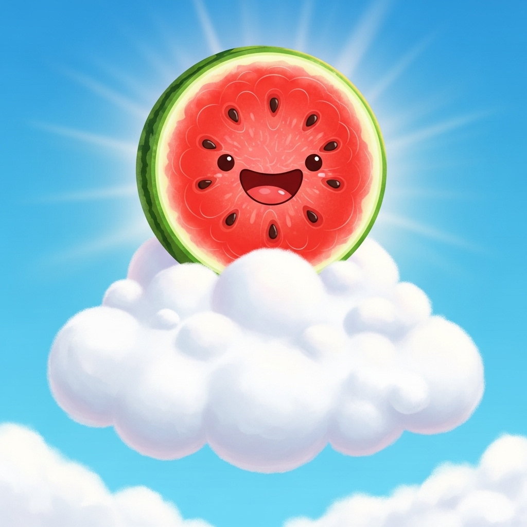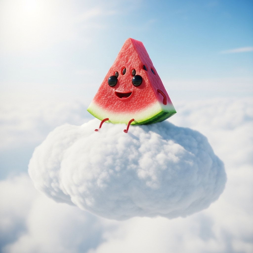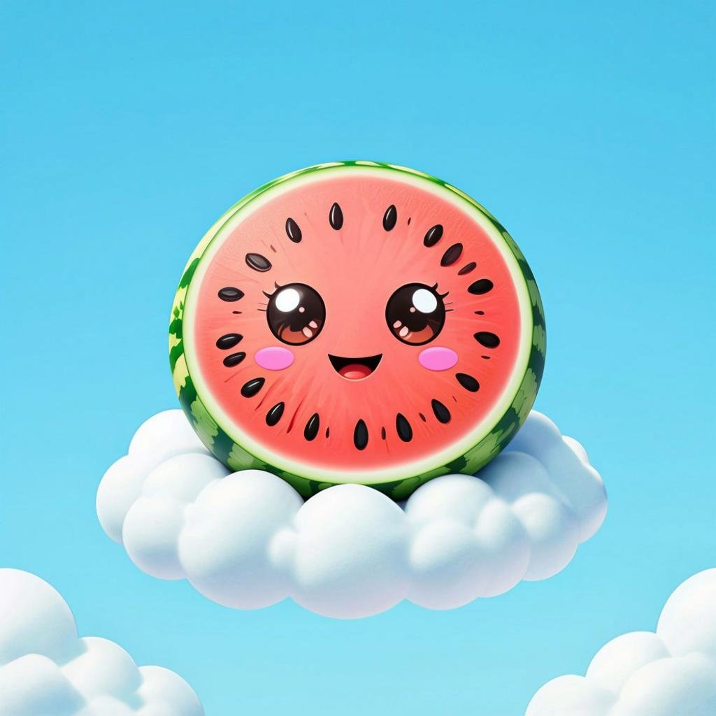 I read your comment and her answer, but it was more about the cyborg lady, nothing about this happy watermelon sitting peacefully on the cloud. And of course, the more important thing of my question is the prompt.