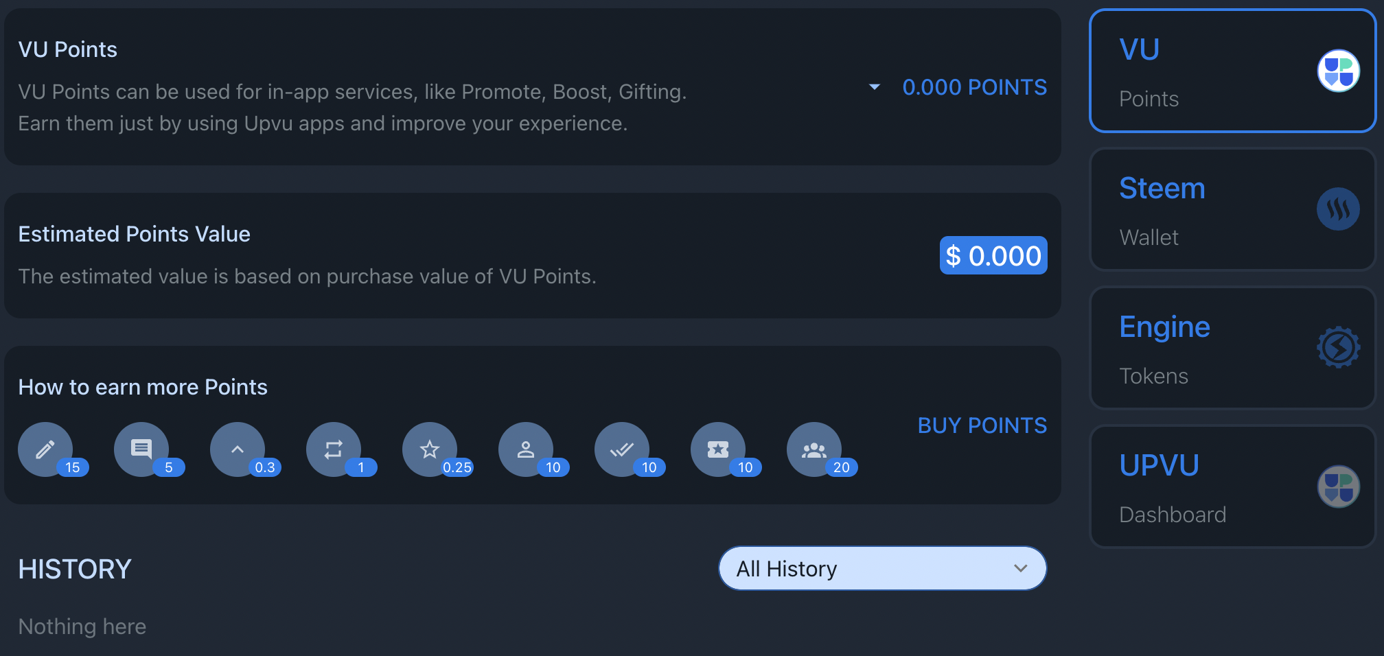 VU Points can be used for in-app services, like "Promote", "Boost", "Gifting". Everyone can earn VU Points just by using Upvu apps and improve your experience.