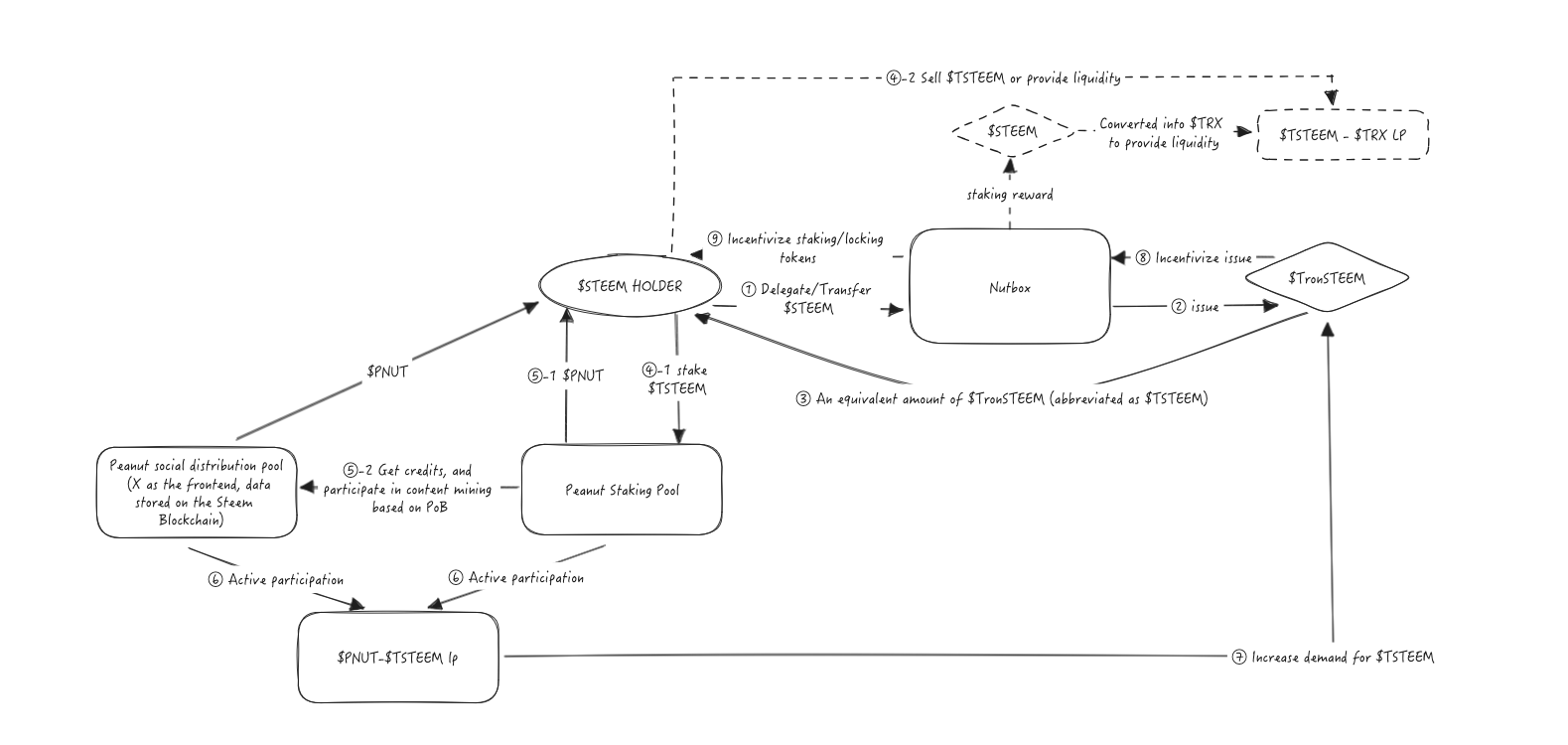 In the diagram above, staking rewards are injected into a $TSTEEM-$TRX liquidity pool, while users who delegate or transfer $STEEM to Nutbox receive the same amount of $TSTEEM. This mechanism is quite similar to Lido’s stETH—it not only connects Steem with smart contract chains but also ties their economic systems together.