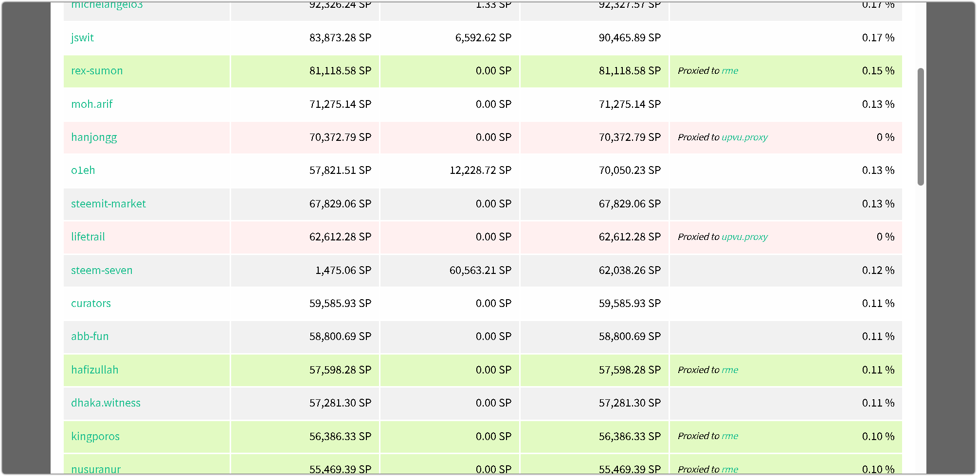 Light green is used to indicate accounts that have designated another account as their voting proxy, and whose influence is being counted because their proxy has voted for the proposal. In contrast, light red identifies accounts that have also set a voting proxy, but whose influence is not being counted since their proxy has not voted for the proposal.